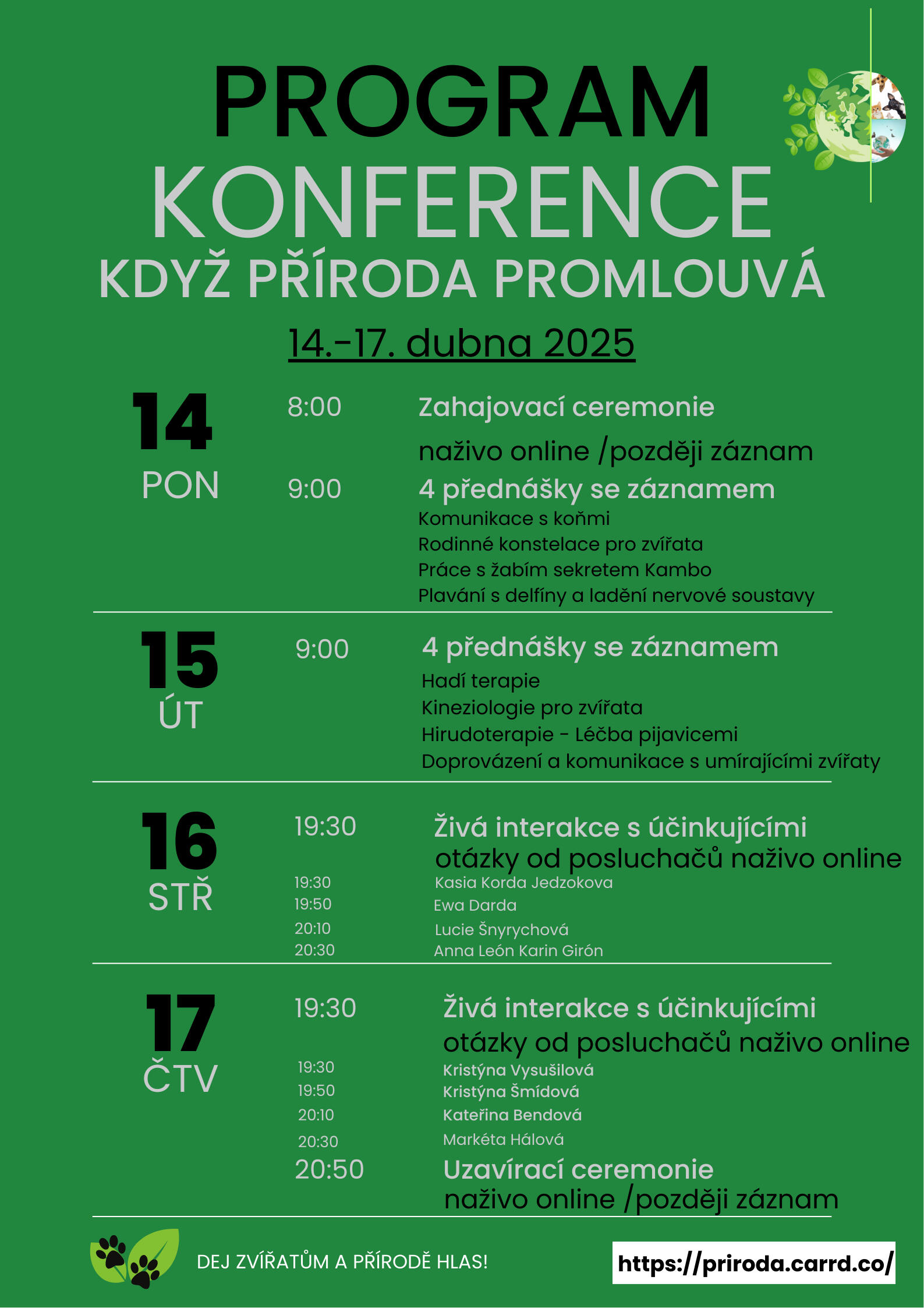 20:30 Markéta Hálová (Kineziologie pro zvířata)20:50 UZAVÍRACÍ CEREMONIE - 10 min, záměr, poslání lásky matce zemi a zvířatům, napojení se na ně
